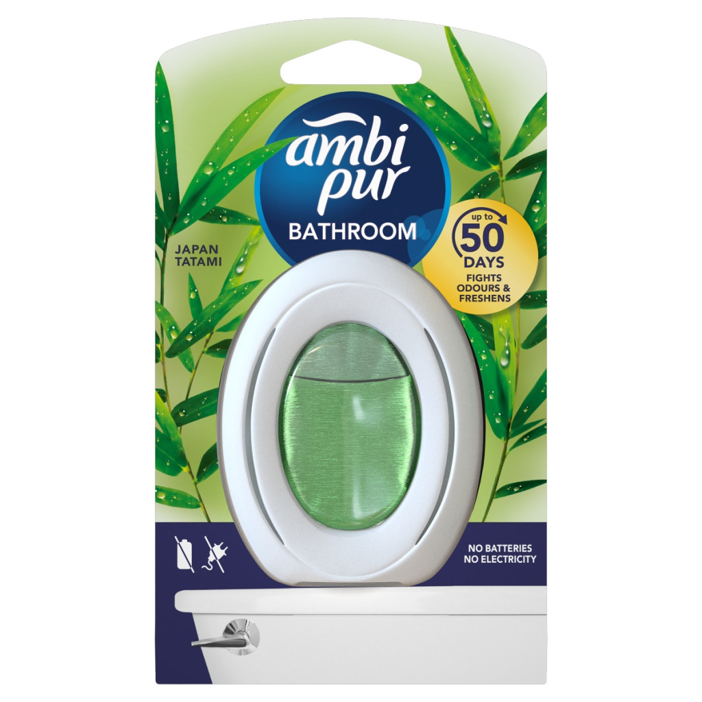 Varázsold fürdőszobádat a nyugalom szigetévé az Ambi Pur Japan Tatami illatosítóval! Folyamatosan semlegesíti a szagokat és akár 50 napon át tartó, kellemes bambusz és zöld tea illatot biztosít, elem és áram nélkül.