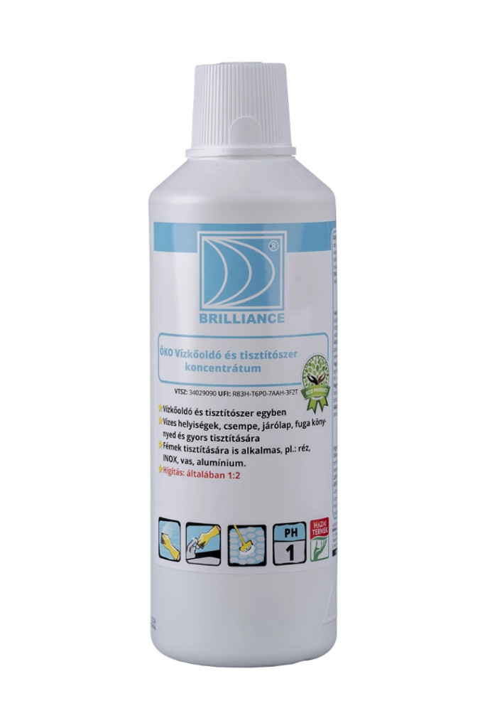 A Brilliance® ÖKO Vízkőoldó és Tisztítószer koncentrátum teljesen környezetbarát ugyanakkor hatékony termék, vízkő és zsíros, olajos szennyeződések egyidejű eltávolítására is alkalmazható , de hatásos INOX felületek tisztítására is az élelmiszeriparban és a vendéglátóipar konyháiban, illetve vizes- és üzemi helyiségekben. Nem tartalmaz illatanyagot, hogy a felületről maradék nélkül eltávolítható legyen. Nem tartalmaz mérgező savat, illetve nem korrozív a fémekre. Biztonságosan használható, hiszen nem büdös és nem marja meg a felületeket, ugyanakkor a legerősebb vízkő is eltávolítható általa.A krómozott és akril felületeket sem bántja, de kíméletlen a vízkővel és a kosszal, szappanmaradványokkal szemben!