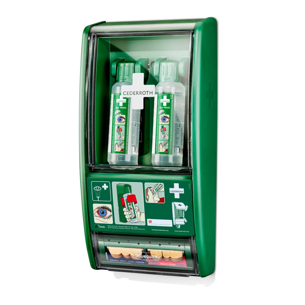 Sebtapaszokkal kiegészített komplex szemkimosó állomás, két flakon Cederroth szemkimosóval, valamint műanyag és textil sebtapaszokkal a biztos elsősegélynyújtásért. Az átlátszó fedél védi a palackokat és a sebtapaszokat a portól, szennyeződésektől, víztől, és segíti a könnyű áttekinthetőséget. A palackok automatikusan kinyílnak a tartóból való kicsavaráskor, lehetővé téve az azonnali öblítést. A sebtapaszok a könnyű hozzáférés érdekében külön adagolókban vannak elhelyezve, és a speciális utántöltő kulcsnak köszönhetően lopásbiztosan tárolhatóak. Az elsősegélynyújtási utasításokkal ellátott fedél mögött további termékek számára is biztosított a hely. A termékek orvostechnikai eszközök, CE-jelöléssel rendelkeznek.