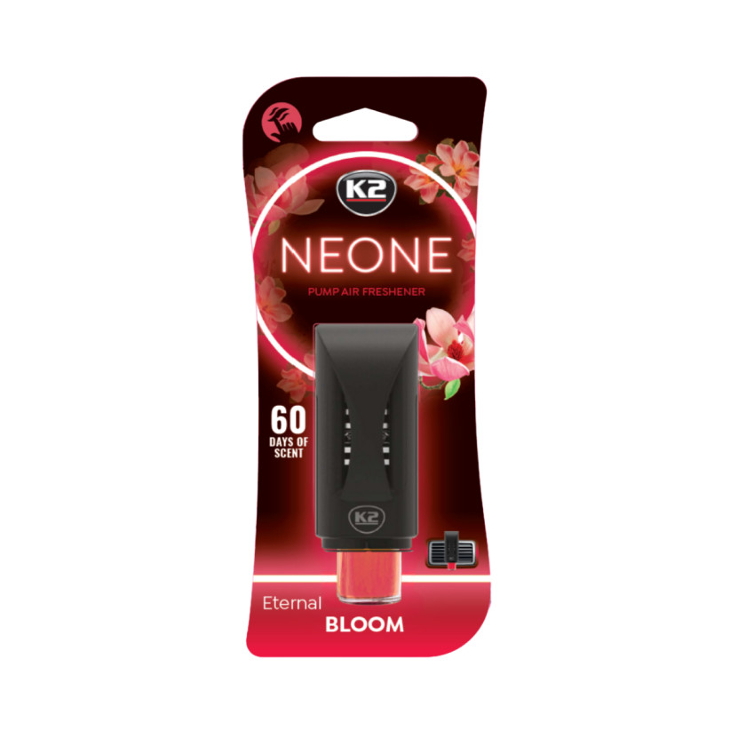 K2 NEONE Eternal Bloom – állítható intenzitású autóillatosító. A K2 NEONE egy illatosító, amely lehetővé teszi, hogy az autóban a hangulatához illő légkört teremtsen. Az egyedülálló pumpás kialakításnak köszönhetően teljes mértékben szabályozhatja az illat intenzitását – a finom akcentustól a jellegzetes, magával ragadó aromáig. Eternal Bloom – egy illat, amely az első pillanattól fogva magával ragad. Érzéki és merész kompozíció, tele kontrasztokkal. A virágos akkordok könnyedségét keleti mélységekkel ötvözi, így luxusos, intenzív és emlékezetes illatot teremt. A lédús egzotikus gyümölcsök és a fekete ribizli friss karaktert adnak neki. A jázmin és a magnólia eleganciát kölcsönöznek, míg a karamell, a cappuccino és a vanília hangsúlyozzák édes és jellegzetes karakterét.  A K2 NEONE kiemelkedik hosszú élettartamával – akár 60 napig is hatékony – és minimalista kialakításával, amely tökéletesen illeszkedik a pilótafülkébe. Az intuitív kezelés kényelmessé és élvezetessé teszi a légfrissítő használatát.