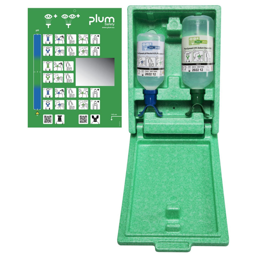 Pormentes fali szemkimosó állomás, polisztirénből, 500 ml pH Neutral DUO szemkimosóval és 1000 ml Plum DUO elsősegély szemkimosó, tükörrel és piktogrammal. Kimondottan alkalmas poros munkahelyi környezetben, üzemekben, ahol mechanikai és vegyszeres sérülések egyaránt előfordulhatnak, és fennáll annak a veszélye, hogy mindkét szem egyszerre sérül. Méretek: 357 x 252 x 116 mm. Az elsősegély szemkimosó flakon 1000 ml 0,9%-os steril nátrium-klorid oldatot tartalmaz. A pH Neutral flakon 500 ml 4,9%-os steril foszfát oldatot tartalmaz, amely gyorsan semlegesíti akár a koncentrált sav- vagy lúgtartalmú anyagokat, azok szembe kerülése esetén. Akár 50-szer hatékonyabb lehet, mint a tiszta víz. A folyadék foszfátokat tartalmaz, amelyek egyébként is jelen vannak az emberi testben. A puffer hidrogén-foszfát összetevője semlegesíti a savakat, míg a puffer másik része, a dihidrogén-foszfát semlegesíti a lúgokat. Mindkettő könnyen kezelhető flakonban, ergonomikus kupakkal, porvédővel és egyértelmű használati utasítással van ellátva. Szavatossági idő: 3 év. Öblítési idő: pH Neutral kb 2 perc, fiziológiás sóoldat kb 5 perc.