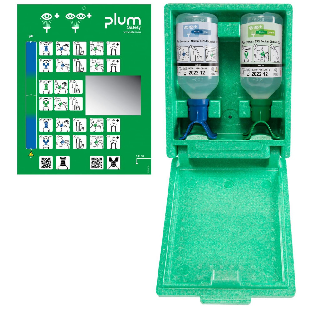 Pormentes fali szemkimosó állomás, polisztirénből, 500 ml pH Neutral DUO szemkimosóval és 500 ml Plum DUO elsősegély szemkimosó, tükörrel és piktogrammal. Kimondottan alkalmas poros munkahelyi környezetben, üzemekben, ahol mechanikai és vegyszeres sérülések egyaránt előfordulhatnak, és fennáll annak a veszélye, hogy mindkét szem egyszerre sérül. Méretek: 280 x 230 x 110 mm. Az elsősegély szemkimosó flakon 500 ml 0,9%-os steril nátrium-klorid oldatot tartalmaz. A pH Neutral flakon 500 ml 4,9%-os steril foszfát oldatot tartalmaz, amely gyorsan semlegesíti akár a koncentrált sav- vagy lúgtartalmú anyagokat, azok szembe kerülése esetén. Akár 50-szer hatékonyabb lehet, mint a tiszta víz. A folyadék foszfátokat tartalmaz, amelyek egyébként is jelen vannak az emberi testben. A puffer hidrogén-foszfát összetevője semlegesíti a savakat, míg a puffer másik része, a dihidrogén-foszfát semlegesíti a lúgokat. Mindkettő könnyen kezelhető flakonban, ergonomikus kupakkal, porvédővel és egyértelmű használati utasítással van ellátva. Szavatossági idő: 3 év. Öblítési idő: pH Neutral kb 2 perc, fiziológiás sóoldat kb 2 perc.