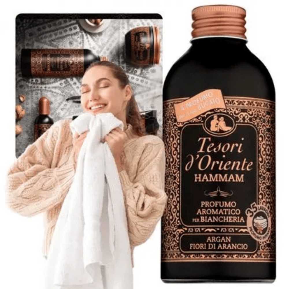 Varázsold ruháidat egyedivé a Tesori d'Oriente Hammam mosóparfümjével! Ez a koncentrált formula argánolajjal és narancsvirággal gazdagítva intenzív, hosszan tartó illatot kölcsönöz minden textíliának.