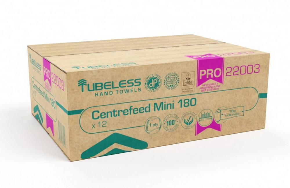 - Tubeless PRO 180 Mini tekercses kéztörlő 1 rétegű, fehér, 100% cellulóz, 726lap, 181,5m 12db/zsugor