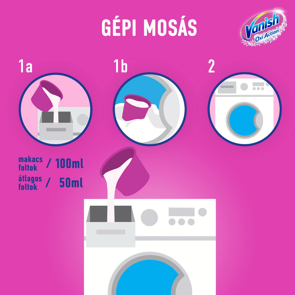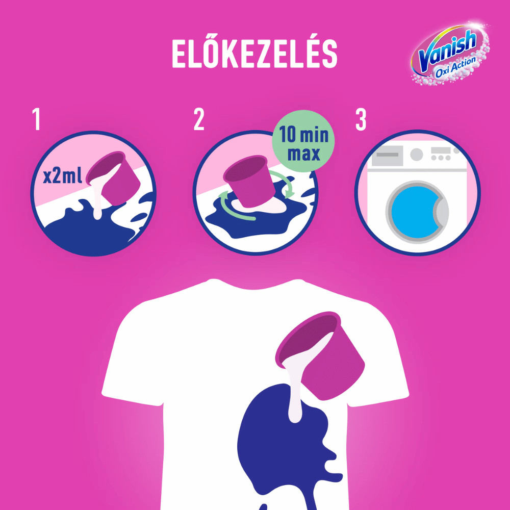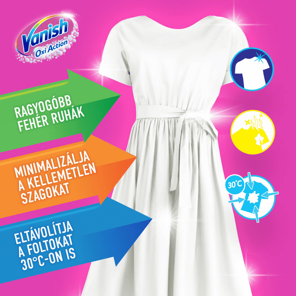 A Vanish Oxi Action White gél extra erős, klórmentes formulája hatékonyan távolítja el a makacs foltokat és segít visszaadni a fehér ruhák eredeti ragyogását már 30°C-on is.