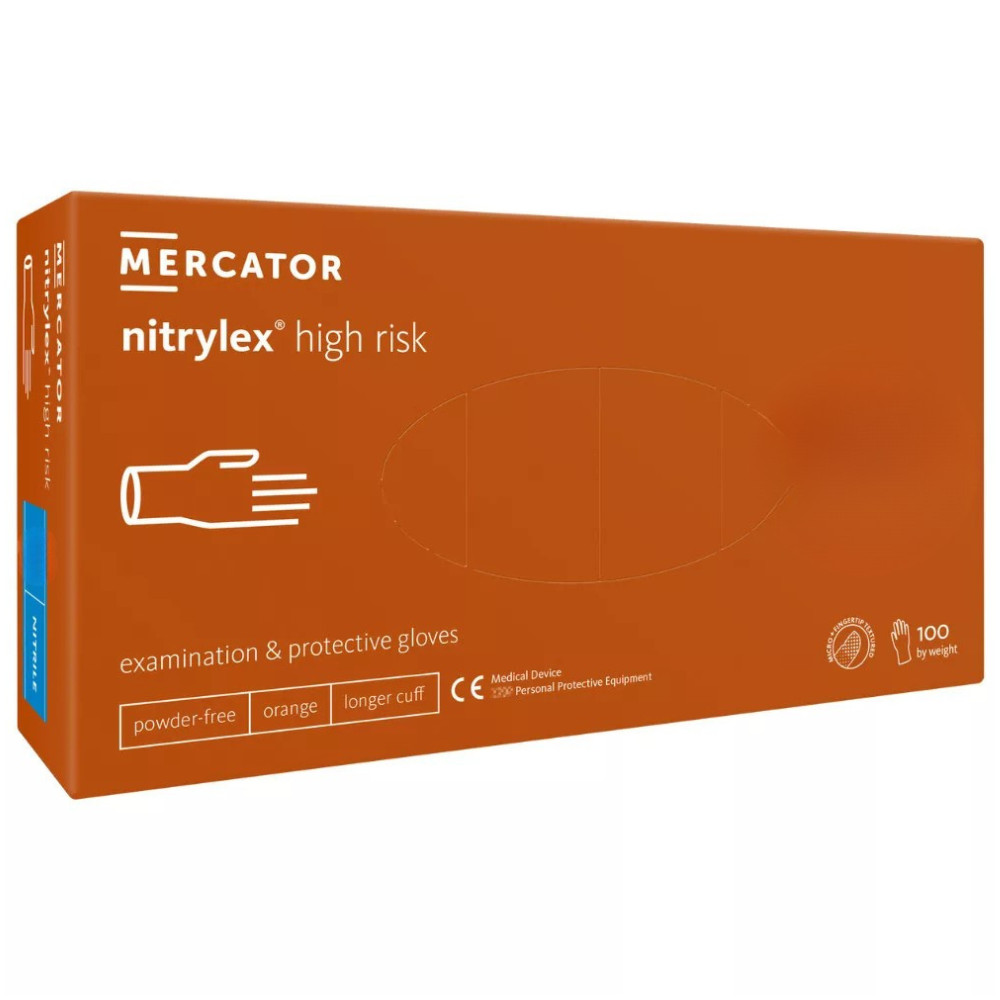 A Mercator nitrylex® high risk kesztyűt kifejezetten a magas kockázatú munkakörnyezetek kihívásaira tervezték. Ez a púdermentes nitril kesztyű jelentősen vastagabb a hagyományos vizsgálókesztyűknél, a hosszított mandzsetta pedig további védelmet nyújt a csukló területén, különösen nedves körülmények között. Ideális választás olyan szakemberek számára, akiknek munkája során elengedhetetlen a maximális szintű védelem a veszélyes anyagokkal és kórokozókkal szemben.