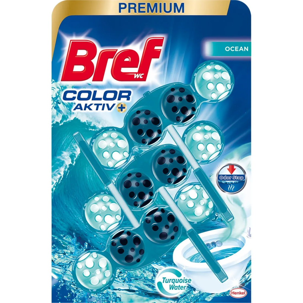 A Bref Turquoise Aktiv Ocean toalett-frissítő 3×50 g hatékony megoldás a WC-kagyló friss és tiszta illatának fenntartására. Az aktív illatblokkok hosszú ideig védik a WC-t a kellemetlen szagoktól minden öblítésnél.